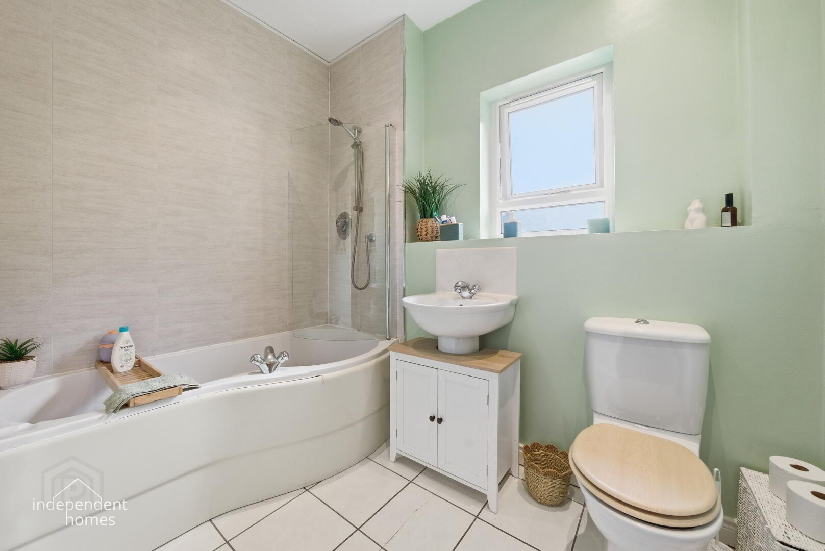 Bathroom: Deluxe white suite including a P-shaped bath with thermostatic shower, pedestal wash hand basin, and push-button WC